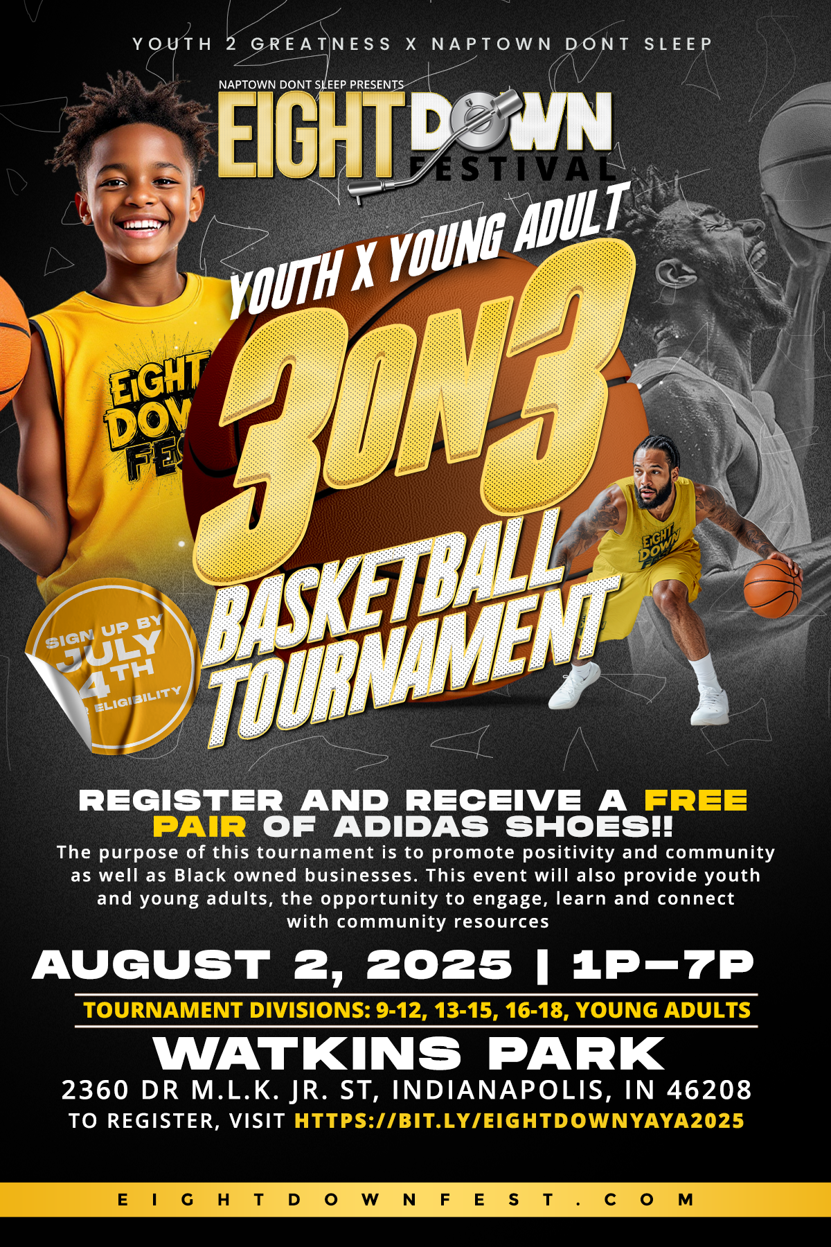 Calling all hoopers. Formal and informal triads of chain rattlers and ankle breakers. You’re being formally called to the three-point arch. It’s time for the Youth and Young Adult 3 on 3 Basketball Tournament at the EightDown™ Festival in conjunction with Youth-2-Greatness Inc.!